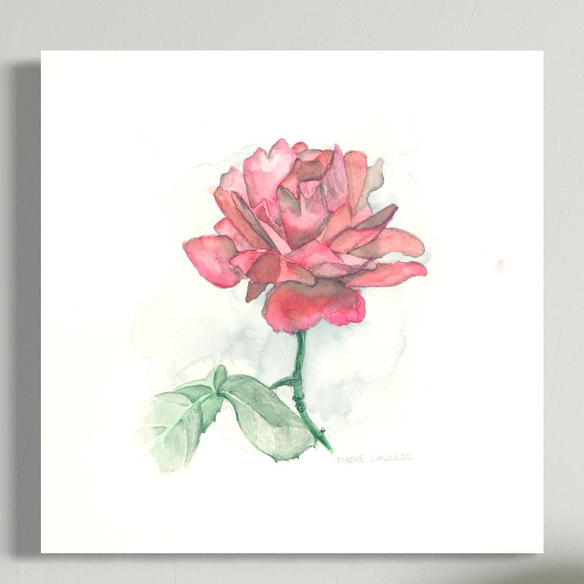 An original 11.5 x 11.5 inch watercolor that highlights the quiet presence of a single rose. The painting focuses on form and tone rather than ornament, with layered washes bringing out the natural depth of the petals. Balanced in composition and color, this work reflects the simplicity and clarity of nature observed directly. Painted with archival watercolors on heavyweight paper, the piece is sold unframed, allowing the collector to choose a frame that best suits their own space and style.